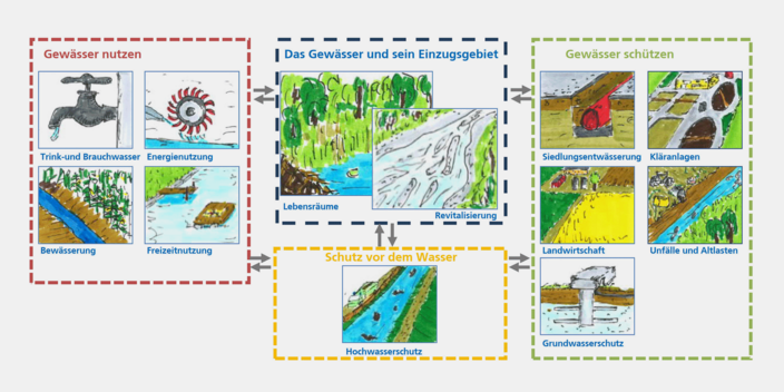 Einzugsgebiete von Gewässern oder Abwasserreinigungsanlagen sind die richtigen Räume, um die verschiedenen wasserwirtschaftlichen Wechselwirkungen zu untersuchen und zu optimieren, Massnahmen zu priorisieren und Erfolgskontrollen durchzuführen.