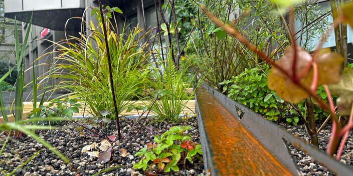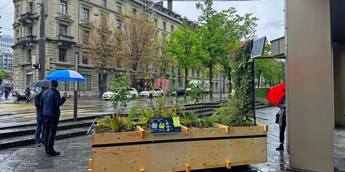Urbane Räume der Zukunft speichern Regenwasser wie ein Schwamm. Anstatt es direkt abzuleiten, wird es während Hitzeperioden von Pflanzen genutzt oder verdunstet. Das Resultat: Niederschläge können vom Untergrund aufgenommen werden; die langsame Verdunstung wirkt als natürliche Klimaanlage, die Lebens- und Aufenthaltsqualität wird erhöht. Ausserdem werden Überschwemmungsschäden durch Oberflächenabfluss verringert und die Kanalisation entlastet. Um dieses Wirkungsgefüge von Regenwasserbewirtschaftung, Beschattung und Kühlung durch Pflanzen sowie Artenvielfalt anschaulich zu vermitteln, haben die Stadt Bern und die Mobiliar in Zusammenarbeit mit Hunziker Betatech die Pocket Schwammstadt weiterentwickelt.