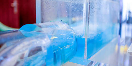 Das aus transparentem Acrylglas gebaute Modell ermöglicht es, das komplexe Strömungsverhalten im Bauwerk direkt zu beobachten. Im Zusammenspiel mit CFD-Simulationen (Computational Fluid Dynamics) wurde so überprüft, ob sich die geplante Konstruktion unter realitätsnahen Bedingungen wie berechnet verhält. Das Ziel: Qualitätssicherung und Optimierung des hydraulischen Designs.