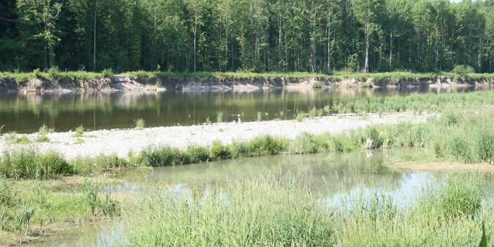 Zentral im Konzept ist, dass die heutigen Dämme entlang der Thur als Fixpunkt bestehen bleiben. Sie sind die Grundpfeiler des grundsätzlich bewährten Hochwasserschutzsystems. Einzige Ausnahme ist die Verschiebung der Dämme in Auenschutzgebieten, damit ehemalige Auenwälder wieder an die Dynamik des Wassers angeschlossen werden können. Zwischen den Dämmen erhält die Thur mehr Freiraum: Das heutige Flussbett soll mechanisch von heute 45 auf neu 80 Meter Breite aufgeweitet werden. So finden grössere Wassermassen Platz und der Wasserspiegel steigt im Hochwasserfall weniger stark an. Eine grössere Aufweitung ist erwünscht, bleibt aber den natürlichen Fluss-Prozessen überlassen. Analysen zeigen, dass die natürliche Flussbreite der Thur bei rund 100 Metern liegt. Schranken in Form von hart verbauten Begrenzungen sollen nur noch dort gesetzt werden, wo es zum Schutz von Dämmen, Brückenpfeilern, Grundwasserfassungen, Siedlungen oder anderer Infrastrukturanlagen zwingend nötig ist. Die Entwicklung der Thur soll mit Beobachtungs- und Interventionslinien kontrolliert werden…»