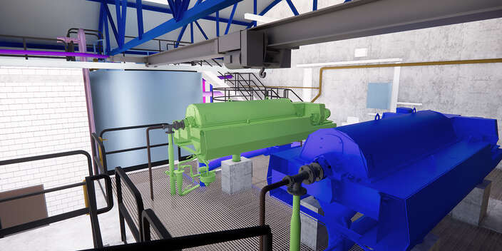 Bis anhin wurde der Schlamm in einer Lagerhalle auf dem Boden verteilt und anschliessend manuell in die Mulden verladen. In der neuen Schlammentwässerungsanlage wird der Schlamm von zwei Dekantern entwässert und in geschlossenen Schneckenförderern automatisch weitertransportiert. Gegenüber den heute bestehenden, offenen Förderbändern wird neu mit den redundanten Maschinen der Aufwand, die Betriebssicherheit, die Hygiene und die Geruchssituation deutlich verbessert.