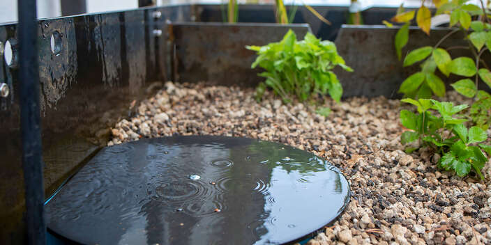 Alle Elemente wurden über einen eigenen, lokalen Wasserkreislauf miteinander verbunden. So wird eine Regenwasser­nutzung über mehrere Wochen möglich.