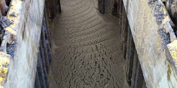 Flüssigboden ist ein Verfahren, bei dem der Aushubboden zeitweise fliessfähig gemacht wird und wieder eingebaut werden kann. Der Flüssigboden ist selbst verdichtend und schafft eben auch unter schwer zugänglichen Stellen wie unter Kabeln und Rohrleitungen eine optimale Verdichtung.