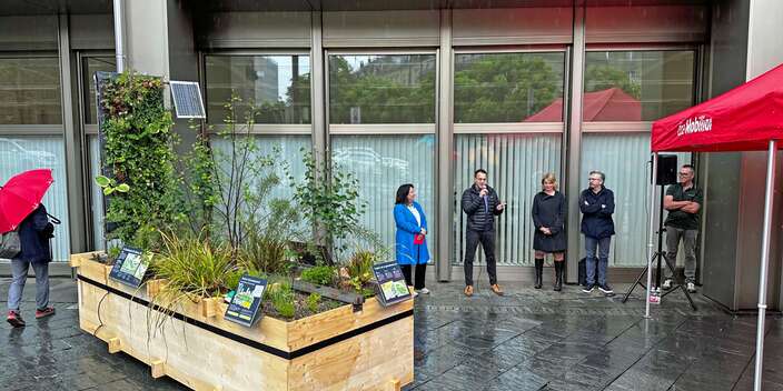Die Stadt Bern und die Mobiliar wollen die Öffentlichkeit für Klimaanpassungsmassnahmen sensibilisieren. Hierfür wurde unser Pocket Schwammstadt-Modell gemeinsam weiterentwickelt. Dieses erklärt das Prinzip der Schwammstadt anschaulich im Kleinformat. Das erste Modell wurde am Montag, 6. Mai, vor dem Sitz der Mobiliar vorgestellt.