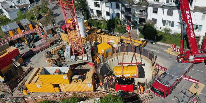 Am Vortag, dem 15. April 2025, wurde die TBM auf die Baustelle transportiert und in die vorgesehene Baugrube eingehoben. Die vorgängig erstellte Baugrube mit einer Bohrpfahlwand als Baugrubensicherung weist einen Durchmesser von ca. 12 Metern und eine Tiefe von ca. 14 Metern auf. Der Einhub der TBM erfolgte mit einem Pneukran und unter Vollsperrung der Eierbrechtstrasse.